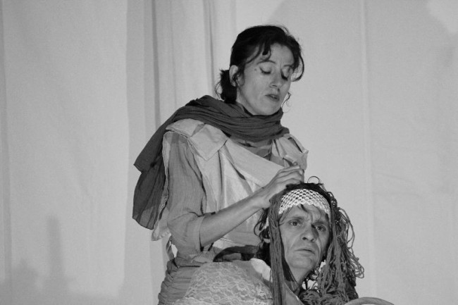 L'adaptation que nous avons faite met en avant le rapport hommes-femmes. Pour cela nous avons créé un personnage qui n'existe pas dans le texte, le mari de Lysistrata. Ce mari est conforme à la société dans lequel il vit, donc sexiste, misogyne voire violent. Ce qui ne l'empêche pas dêtre amoureux, tendre et plein de désir pour sa femme. Cette femme qui voit revenir les morts jour après jour, et qui n'a pas droit à la parole, comme toutes les femmes qui attendent l'improbable retour du guerrier. Tout en élaborant son plan, elle affronte son mari et le pousse à jouer la cause des hommes, tandis quelle joue la cause de toutes les femmes.