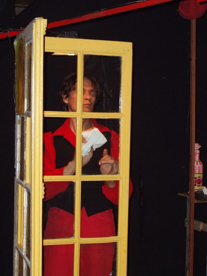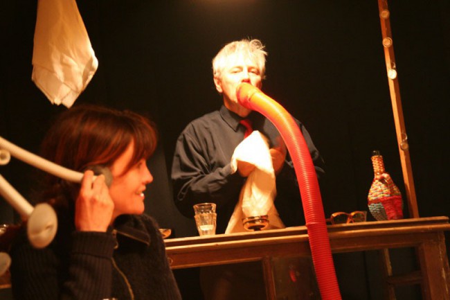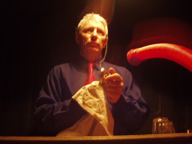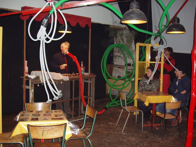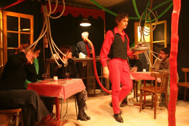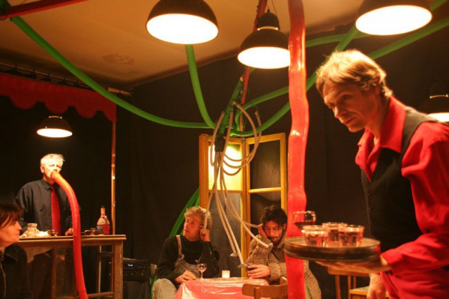 Dispositif scénique : un bar, quatre tables, des fenêtres, un miroir, des tuyaux qui relient le bar aux tables, 20 chaises.